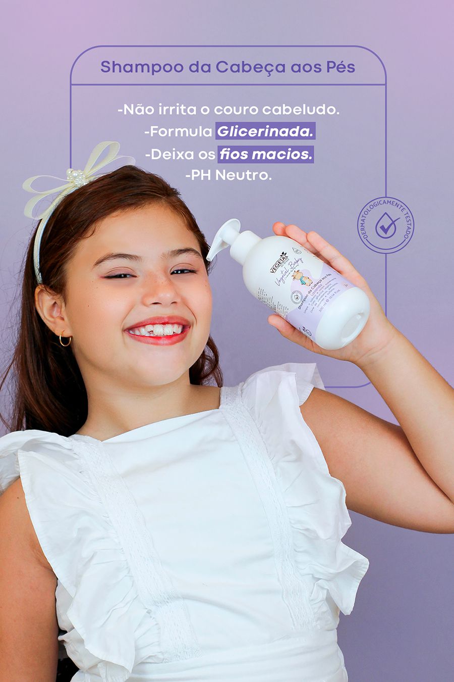Como usar: Aplique o Shampoo Vegetal Baby nos cabelos molhados, massageando-os suavemente até obter uma espuma cremosa. Em seguida, enxague bem com água.